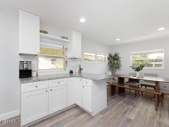 BEAUTIFULLY UPDATED CONCRETE BLOCK, SINGLE STORY FRESHLY PAINTED INTERIOR and Power washed the exterior - in '2022 remodeled to include opening up the floor plan, Brand new kitchen, Dining room with new window, most windows are newer, New Roof, New HVAC and NEW Duct work, new water heater, NEW LVP Flooring throughout, blinds throughout.