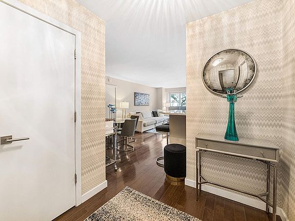 As you enter this beautiful home, you will be greeted by a large foyer that has been draped gorgeous in Missoni wallpaper. The foyer is flanked by a large coat closet and a fabulous full bathroom adorned with marble throughout. The hardwood floors will lead you to the cleverly designed eat-in kitchen. The open kitchen boasts stainless steel appliances, quartz countertops, a breakfast bar, and an in-unit combo washer/dryer. With lots of counter space and storage, you will actually want to cook in this apartment! 2B features an oversized living room which allows for both living and dining areas. Behind the dining area, you will find another large and fully outfitted closet.