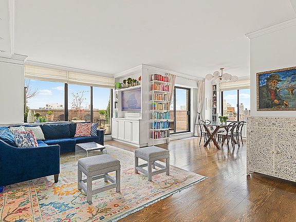 Classic detailsFloor to ceiling windowsHuge private terraceCustom built-in storageCrown moldingsElegant wall coveringsWood floors