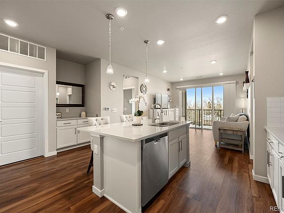 Now offered at a super competitive price for a limited time—don’t miss out! Welcome to this fantastic condo in the highly desirable Littleton Village! This charming 2-bed, 2-bath home offers a light-filled, open floor plan with high ceilings and convenient one-level living. Step inside to a beautifully designed kitchen featuring a large eat-in island, soft-close white cabinets, stainless steel appliances, and sleek quartz countertops. The kitchen flows seamlessly into the spacious living room, which opens to a covered balcony with peaceful open space views—perfect for relaxing or entertaining. The primary suite features a private ¾ bath and a generous walk-in closet, while the well-sized second bedroom is paired with a full bathroom. Designed for comfort and convenience, the home also includes a dedicated laundry room, coat closet, and linen closets for ample storage. Easy elevator or stair access makes coming and going effortless. Additional perks include extra storage space and two parking spots—one reserved space in the secure community garage, and another in the community lot. Residents enjoy top-notch amenities including a fully equipped fitness center, rooftop patio with barbecues and fire pit, and access to Littleton Village’s dog park, neighborhood park, and playground. Just steps from Starbucks, The Social Bar & Lounge, and more dining options, this location is hard to beat. With quick access to Downtown Littleton, DTC, major highways, Chatfield State Park, and shopping centers—you’ll love calling this place home.