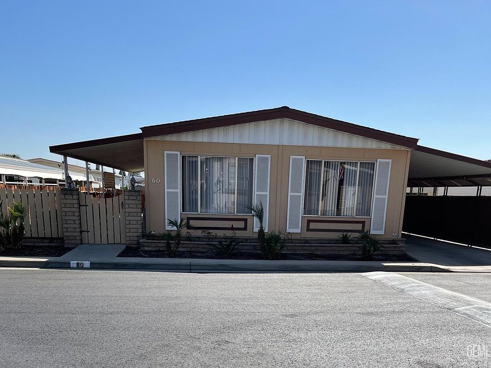 Nice spacious home in a quiet gated 55+ community mobile home park. This home features 2 bedrooms, 1.75 baths, formal living, formal dining with built in hutch, family living room with fireplace, spacious kitchen with eat-in breakfast bar, indoor laundry with lots of space, covered patio to enjoy those relaxing sunny days, covered 2 car carport, storage unit and storage cabinet. The community provides a beautiful clubhouse for lots of entertainment and a swimming pool on those sizzling summer days, a big park to enjoy watching your pets run and play. This home will go fast in this highly sought-after community. A must see!!