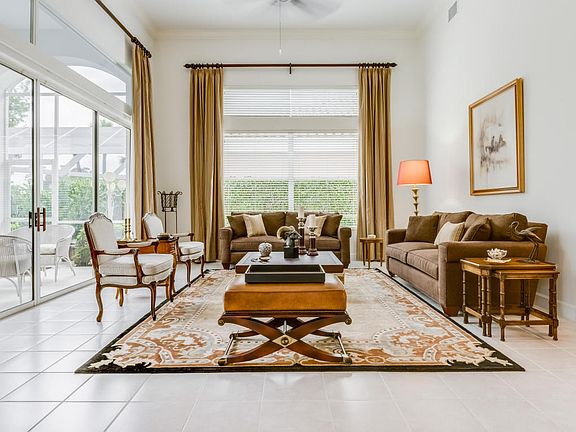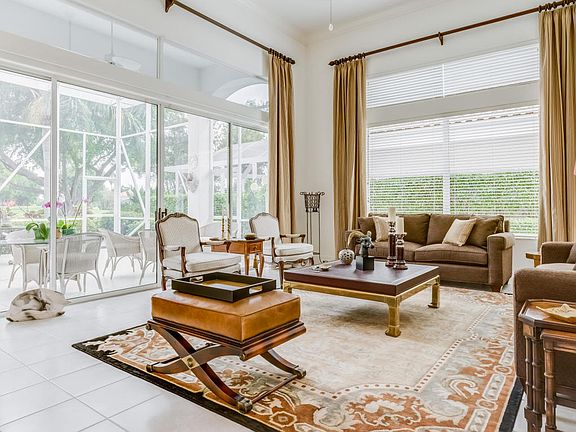 Relaxing golf views from this light & spacious, immaculate, 3BR/3BA remodeled open home with a perfect floorplan, located on a private corner in a park-like setting in the highly sought-after Eagleton community of PGA National. This home has many desirable features, such as soaring volume ceilings, crown molding, porcelain floors, massive windows, wall-to-wall sliding glass doors with clerestory windows above, an oversized fully-updated kitchen with modern white cabinets, newer appliances, high-end granite, and a wine cooler, and a huge master suite with panoramic views, large walk-in closets, and a newer shower with stone-pebble flooring in the master bath. The large, screened-in patio has plenty of space for entertaining and overlooks the golf course. Newer roof, paint, and water heater.