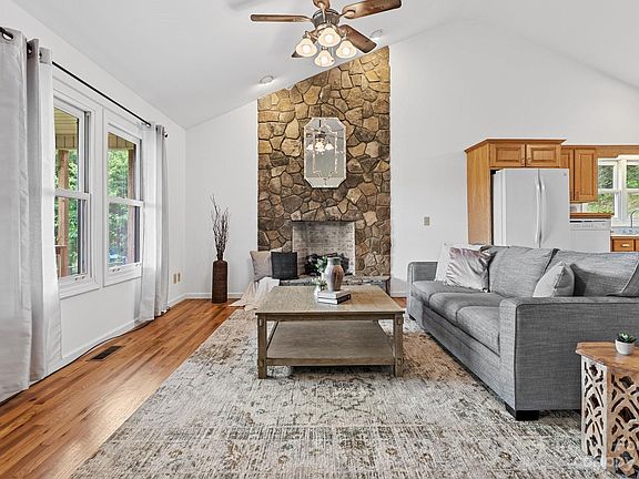Experience country charm in this quaint 3-bed, 2-bath farmhouse in the Bethel area of Canton, NC. Nestled on 1.23 acres with year-round mountain views and tranquil pastoral setting this home offers the best of rural living. Inside an open-concept kitchen, dining and living area is highlighted by a floor to ceiling gas fireplace, wood floors and bright interior. Enjoy sunlit afternoons on the covered porch, overlooking the fenced front yard while taking in the picturesque setting. A full unfinished basement offers garage access and ample storage. Exceptionally situated, you're a leisurely walk from the flourishing “10-acre garden” and the pristine trout waters of the Pigeon River. With downtown Waynesville and Canton just a 10-minute drive away, amenities are within easy reach. Proximity to the Blue Ridge Parkway and Shining Rock Wilderness promise endless adventures. Open the door to the simple life: surrounded by nature’s beauty and local charm.