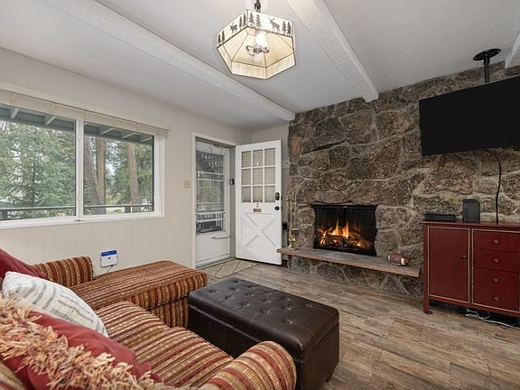 The living room has a flat screen TV with cable and wood burning fireplace. The couch in the living room has a queen sofa sleeper.