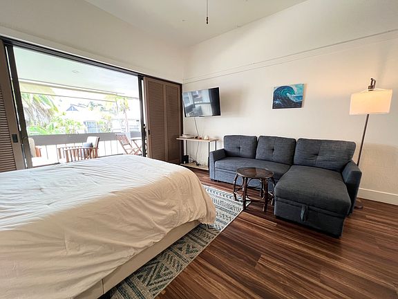 This fully furnished unit has updated koa-style vinyl flooring, Acacia wood kitchen counter, newer appliances and updated tiled bathroom floor and shower. This third floor unit has large sliders that open to the balcony overlooking the pool.