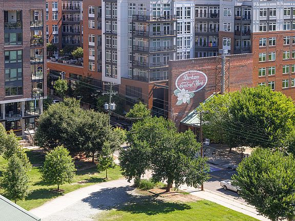 Stunning and immaculate top floor penthouse offers timeless beauty, comfort, and ease of living. From this corner unit, enjoy brilliant natural light and southeastern views over Durham Central Park. Exceptional features include high ceilings and loads of upgrades- beautiful crown moulding, built-in floating console and bookshelves, built-in shelves and a utility sink in the flex room/office. Signature floor-to-ceiling, fully retractable glass wall to the balcony elevates the natural beauty in the main living space for gracious and sophisticated entertaining. Refined window treatments, black out shades, and custom light fixtures throughout. Storage options abound, with a huge conditioned room down the hall which conveys with a wine cooler, superb custom closet organizer systems in the owners suite closets, as well as an unconditioned storage closet in the garage in front of the parking space on the upper parking level off Hunt St. Enjoy being steps away from the Farmer's Market activities, outstanding artisans and crafts, delicious food and produce. Close to restaurants, walking and bike trails, playgrounds, and dog parks. Easy commute to Duke, UNC, NCCU, and RTP.