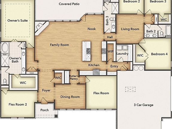 Discover the allure of the Foxglove, an epitome of sophistication and comfort crafted by Riverside Homebuilders. This luxurious one-story abode spans 3,497 square feet, offering 4 bedrooms and 3 bathrooms, meticulously designed for modern living. With a 3-car garage and a thoughtful layout, convenience and elegance seamlessly intertwine to create an unparalleled living experience. As you step through the front porch, you're greeted by an open and airy foyer, setting the tone for the home's inviting atmosphere. To the right, a luminous dining room awaits, perfect for hosting memorable gatherings with friends and family. Adjacent to the foyer, discover two versatile flex rooms, adaptable to your every need-whether it be a home gym, office or creative space. Continue through to the heart of the home, where the magic unfolds-a sprawling family room adorned with a cozy fireplace, nestled near a charming nook and a chef-inspired kitchen boasting ample counter space and storage areas. On the right side of the home, three traditional bedrooms each feature a walk-in closet and are accompanied by two bathrooms for utmost convenience. The laundry room further enhances functionality, making chores a breeze. For added entertainment, indulge in the media room, ensuring every member of the family has a space to fulfill their passions. On the opposite side, the owner's suite awaits, offering a sanctuary of luxury with top-quality features, a stunning owner's bath and an incredible wa...