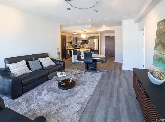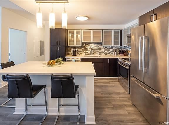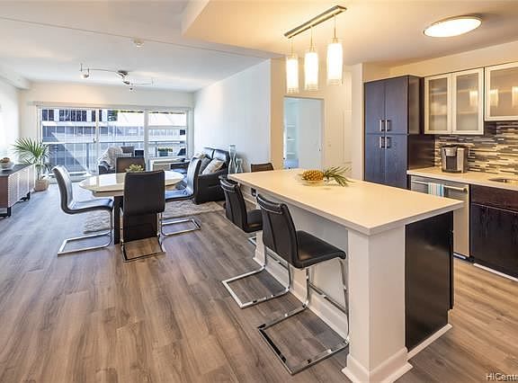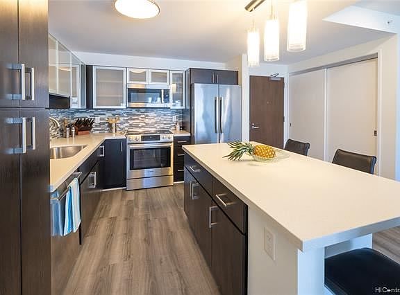 LOCATION, LOCATION! 400 Keawe is conveniently located near just about everything you would need or want. Yet this stunning PH/6TH floor upgraded unit is quiet and peaceful while you enjoy the simple lifestyle of condo living. Kitchen offers upscale Bosch appliances, white quartz countertops, smoked modern glass cabinet faces on espresso cabinetry. A large island that is perfect for entertaining. FRESH NEW interior paint, BRAND NEW flooring AND bedroom carpeting, NEW master shower door and hardware. PTAC air conditioning in both bedrooms and living room, full size newer LG washer/dryer, master walk in closet and automatic custom window shades. There is additional cabinetry, and built in desk that is a great flex area perhaps for remote working or a mini bar. This home shows like a model unit. There are sprinklers for fire protection safety. Enjoy city, mountain & distant ocean views from the lanai while having your morning coffee on the lanai. Low maintenance fees, and secured building. Love, Live, Play and Thrive in this vibrant hip neighborhood called Kakaako and all that is has to offer. Click on the awesome video that shows the unit and lifestyle of Kakaako.