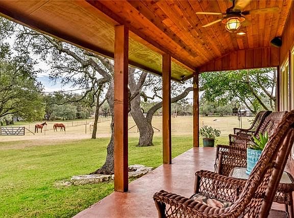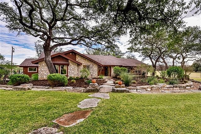 TAKING BACKUP OFFERS: Tour this very private ranch style home with 100 to 200-year-old trees covering the property. Enjoy your morning coffee while sitting on the covered back patio looking out to the pasture. This single story home boasts beamed, wormwood ceilings, unique built-ins, lots of storage throughout, and a floor to ceiling stone fireplace! One of the HVAC units was replaced in 2015 and new carpet installed recently.