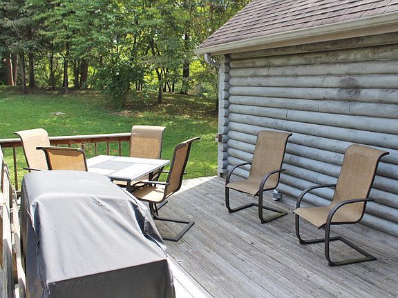 Beautiful log home close to the lake, and close to town, and on a wonderful 1 acre lot. Open floor plan, with hardwood flooring, and high ceilings. Stone fireplace, 2 Master suites on the main floor, and loft area upstairs, with 2 more bedrooms. Fully furnished. Finished basement with 2- 1 car garages. Nice landscaping and a seasonal view of the lake. Storage shed. Great lake home or full time residence. Dont miss out on this home.
