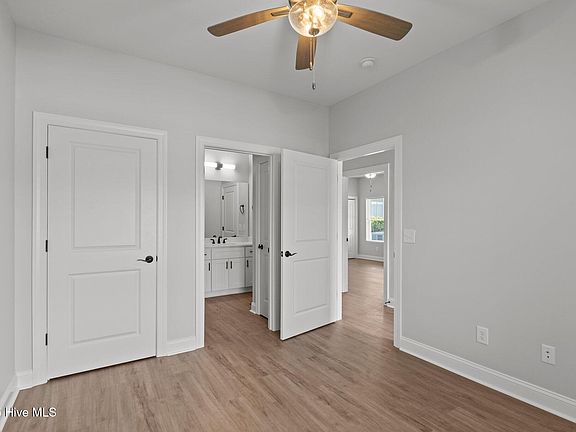 New Construction in Cape Carteret NC at Villages of Megans Bay. Uh=nit has 2 bedrooms, 2 baths, a great room with kitchen ,dining and living area, and even a private deck. Unit has LVP flooring throughout, quartz counters, stainless appliances, large island and shaker style cabinets.