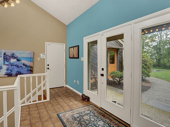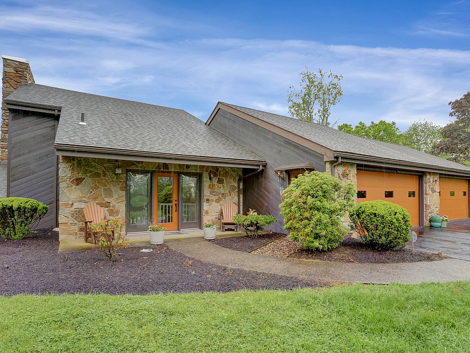 A little slice of heaven, this custom-built contemporary cedar and mountain stone home is nestled down a private driveway on 4.5 acres of natural beauty where wildlife abounds. This is a passive solar home featuring a berm design, that faces due south to take advantage of warm sunny winter days. Enter into the home and be greeted by soaring ceilings with beautiful lighting, a sunken living room and dining area, and a dramatic stone-faced double-sided fireplace. Many renovations completed on this home, including new flooring in many areas, paint, a new custom-built master suite with an expansive walk-in closet, updated kitchen appliances, exotic granite counter tops, new disposal and sink. Living and dining room wood floors were recently refinished. An oversized 4-car garage is also featured. Home is energy efficient, with 12-inch thick walls, and a geothermal heating and cooling system. An additional heat pump was added to the master suite for added comfort. This property shows better than the photos! Note: owner is licensed real estate agent.