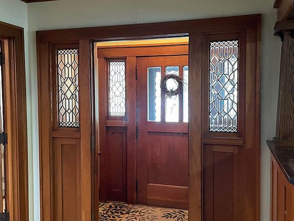 Large 4 bedroom 1 1/2 bath home. With large spaces and lots of beautiful woodwork and accents this home needs someone with a vision of what grandeur this home could command. With beamed ceilings and a large open staircase with stained glass windows it impresses on entry. The main floor has a large living room with bay window and fireplace, as well as a dining room and kitchen. There is also a 1/2 bath on the main floor. The second floor has 4 large bedrooms and a full bath. There is a walk up attic and a full unfinished basement.