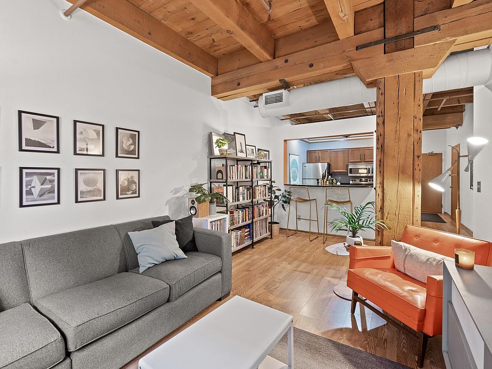 Exposed brick and timber beams create a warm city vibe in this spacious one-bedroom condo at Riverwalk