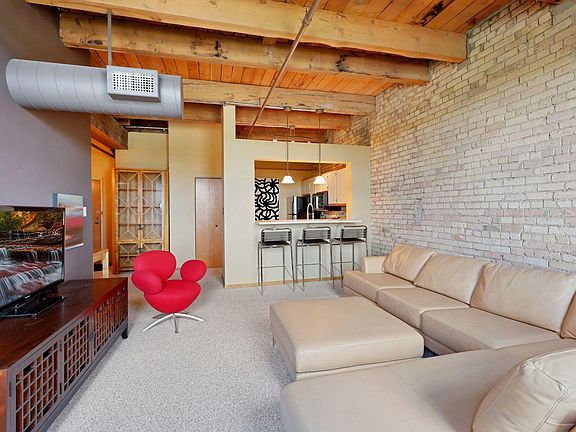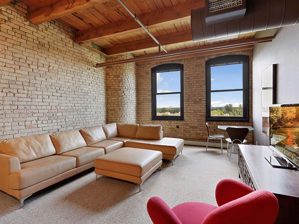 Enjoy long, protected, treetop views from this authentic Loft at Riverwalk. Original brick walls and wooden beams, two(tandem) heated indoor garage spaces, generous storage room. Great opportunity to build equity and make your own finishing touches. Amazing North Loop location, just one block from Mississippi riverfront.