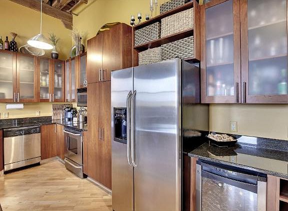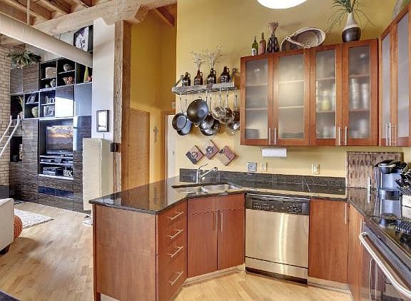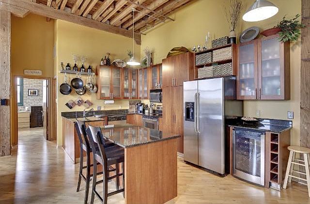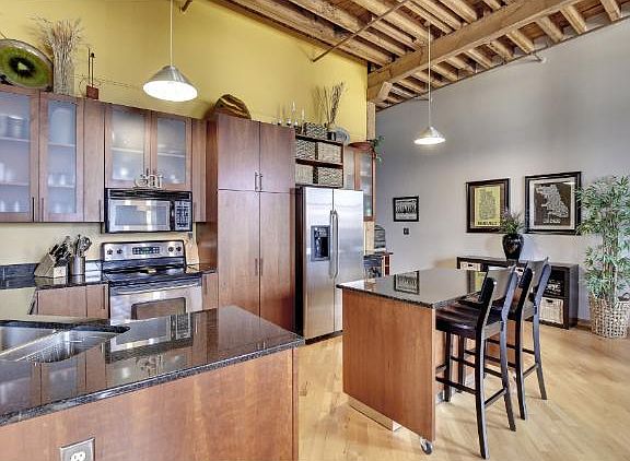 Top flr. corner unit w/cust. wall system in living area. Kitchen w/granitecounter, moveable center island on wheels and frosted glass uppers. Hrdwd. flrs. and cust. closets in BR. Coin laundry on every flr. Great North Loop location-one block to river!