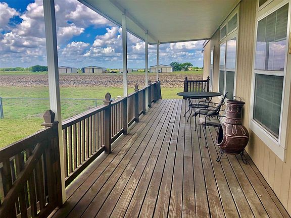 Well cared for home outside the city limits. Large living area upon entry. Kitchen has great cabinet and counter space plus the refrigerator is included. Split bedrooms. Master bathroom has large shower, dual sinks plus a huge closet. No carpet all wood look flooring throughout home. Large covered back porch with great views. Storm shelter included. Electric, water, trash services and yard care included for an additional fee of 300.