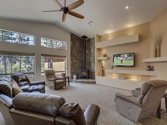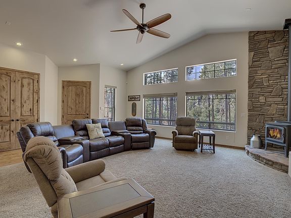 Enjoy country style living in this impressive home located on 1.37 acres and inside town limits. The corner, treed lot providesa perfect setting for enjoying cool temperatures with the sound of wind blowing through the large Ponderosa pine trees. The expansive great room blends easily with dining and kitchen space. The designer kitchen has a Dacor 6-burner gas cooktop stove with electric dual ovens, beautiful granite countertops and custom crafted knotty alder cabinets. Each bedroom with ensuite bath has maximum privacy and is accessible to decks or patios. The spacious family room locateddownstairs has many uses: entertainment center, billiards, or additional overnight quarters. The corner lot has space for horses, trailers, and RV's. You will love the home and the location.