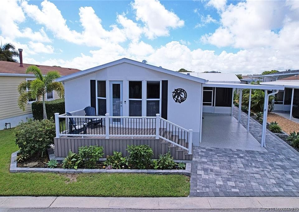 Prime locatiοn іn ѕought-aftеr Juрiter River Park. Thіs turnkеy, furnished 3BR/2BA + bunk room home was renovated in 2023. Stucco, impact windows/doors, metal roof, HVAC, water heater & water filtration, paver drive, landscaping, auto sprinklers. Bright & open w/vaulted ceilings. Custom cabinets, quartz tops, SS appliances, & laminate floors. Screened patio w/large storage room & storage below deck. Steps away to beaches, parks, dining, & community marina. This is a 55+ community where you OWN the land and a low HOA of $157.00 per month includes management, clubhouse, comcast cable & internet. Community boat slips and storage (see dock master for availability).