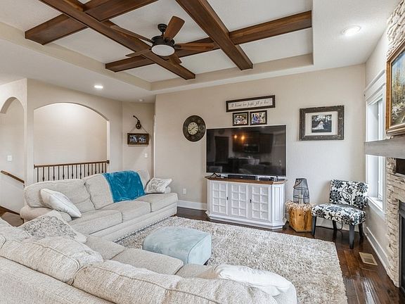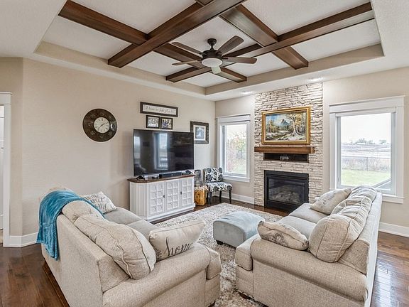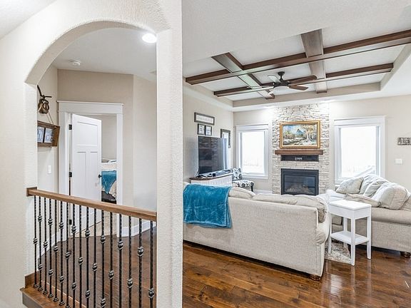 MOTIVATED SELLERS! This custom-built home is loaded with quality construction details, including 2x6 framing, Hardie-plank siding, and Andersen windows. This beautifully crafted open-concept ranch home boasts stunning hardwood floors throughout the entry and living areas, complemented by 9-ft ceilings and upgraded trim. The spacious living room features a striking coffered ceiling and a floor-to-ceiling stone fireplace, creating a warm and inviting atmosphere. The large kitchen and dining area offer a two-tiered island with granite countertops, soft-close cabinets with full-extension drawers, a walk-in pantry, and stainless steel appliances perfect for cooking and entertaining. The primary suite is a retreat, complete with a tray ceiling, an en suite with dual sinks, a full tile shower, and a generous walk-in closet. Two additional well-sized bedrooms, a full bath, and a laundry area complete the main level. The finished lower level offers an oversized living space ideal for entertaining, featuring a wet bar, a large bedroom, an office/exercise room, a full bath, and ample storage. Recent updates include a new shed (2023), master closet shelving, and a new dishwasher. From the arched stairwell to the custom kitchen, this home exudes character and charm. Don't miss the opportunity to own this exceptional property, schedule a tour today!