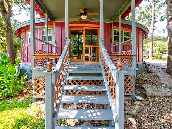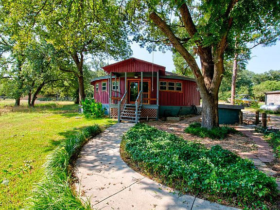 This unique, two-bedroom, one-bathroom circular home is a perfect retreat. Nestled in the beautiful town of Nocona, it offers a stunning lake view. The home features original hardwood floors that add warmth and character to the open-concept space. A striking fireplace sits at the center, which has been converted to a propane unit, surrounded by beautiful brick flooring that defines the living area. This move-in-ready home is an excellent option for a tranquil retirement or a memorable Airbnb experience.