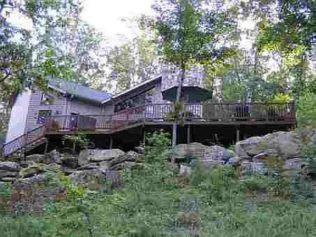 This is a truly unique custom built home designed by the owners and built onto the hillside maximizing the landscape features and the view of Lake Barkley. The great room has a multi-faceted vaulted ceiling and two story stone fireplace. The large master bedroom catches the morning sunlight in the leaded glass window and has a view of the lake. The kitchen has lighted/glassed cabinet doors to display dishes and an island with a glass cook top and embedded vent. The large deck wraps around two lake sides