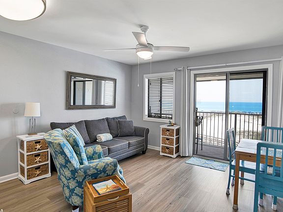 This charming 1-bedroom, 1-bathroom condo is located directly on the Gulf of Mexico in Gulf Shores, Alabama. With its private balcony and stunning views of the beach, this condo is the perfect place to relax and unwind after a long day of exploring the Gulf Coast. The condo is beautifully appointed with luxury vinyl plank floors, granite counter tops, and stainless steel appliances. The living room is inviting, with a comfy sleeper sofa and a large 65” TV. The primary bedroom features a queen-size bed. The bathroom has a tub / shower combo with ceramic tile. There are hallway bunk beds that can sleep up to two additional guests. The condo is located in a quiet, secure 24/7 gated resort with indoor and outdoor pools, hot tub, tennis courts, pickleball, sauna, steam room and a fitness center. The condo is located just a short walk on the boardwalk to the beach. There are multiple restaurants nearby as well as one of Alabama's top public golf courses, Kiva Dunes. Condo mechanicals are in great condition as the water heater was replaced in 2015 and inside/outside HVAC units are new as of 2021. This is a rare opportunity to own a fully furnished piece of paradise on the Gulf Coast.
