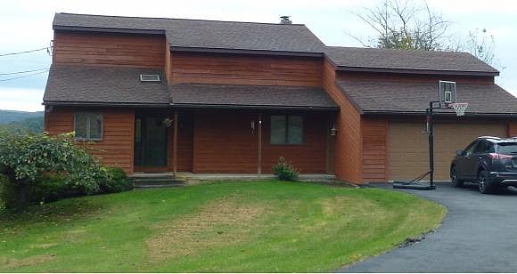 Beautiful home on a gorgeous setting of 18+ acres. Living room boosts cathedral ceilings, cobblestone fireplace with wood burning fireplace. Plenty of windows to enjoy the fabulous views. Kitchen has been updated and has an open view of living area. Master bedroom has double closets not to mention a private deck overlooking the valley.FR also has a wood stove to enjoy those cozy winter nites.
