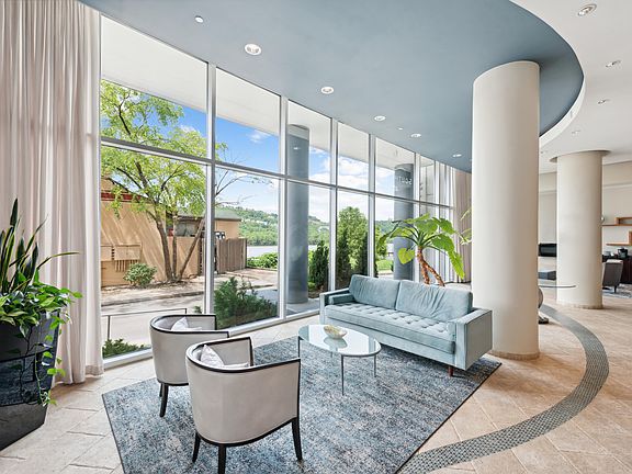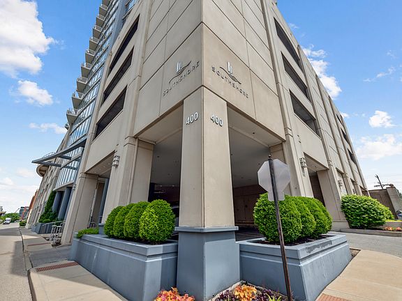 Luxury NO STEP Capri floor plan with 2 assigned parking spots, secured garage. Beautiful well kept unit with STUNNING RIVER and CITY views. Study comes with a queen size murphy bed for overnight guests! Hardwood floors, beautiful cabinetry through out, stainless steel appliances with gas cooktop, built in bar with wine cooler, tankless water heater, and washer and dryer stay. Enjoy all the South Shore amenities-- Clubhouse, pool, fitness center, staffed security desk, professional mgmt, and Direct TV included in HOA.