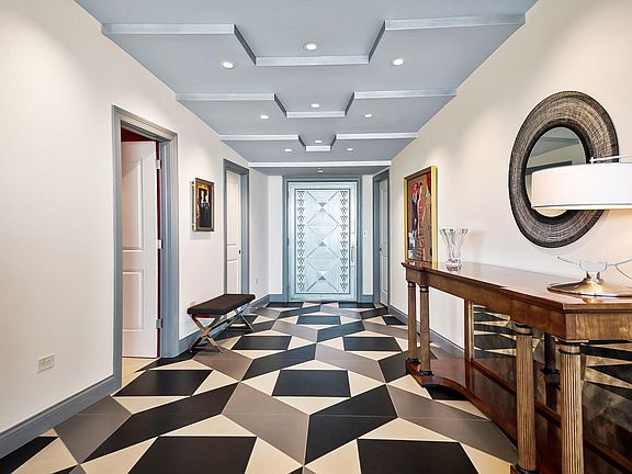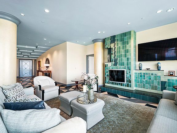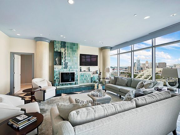 Discover luxury in this 4,975 sq ft Art Deco-inspired penthouse featuring a grand foyer with stepped ceiling and angled walls leading to panoramic city and river views through 125 ft of floor-to-ceiling glass. Boasts an open floor plan with 4 bedrooms, 3 full and 2 half baths. Highlights include a Rookwood Pottery custom fireplace, formal dining, and a gourmet kitchen with high-end appliances and granite counters. Home theater mimics Golden Age Hollywood with bespoke details. Office and lounge feature Olive Burl wood and a black granite bar. Includes five storage closets and four garage spaces, three enclosed. Building amenities include 24-hour concierge, outdoor pool, clubhouse, and exercise room. Located near dining, attractions, and parks. A testament to luxury living.