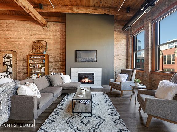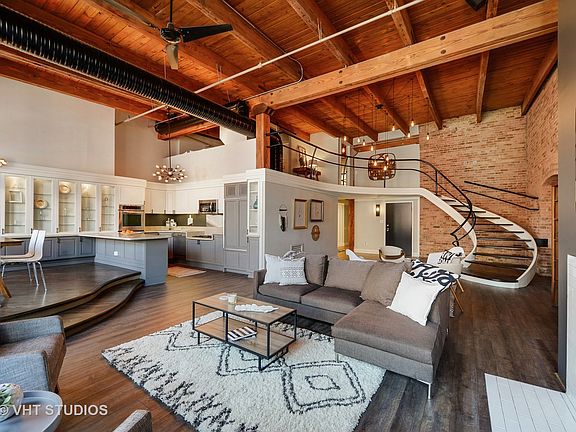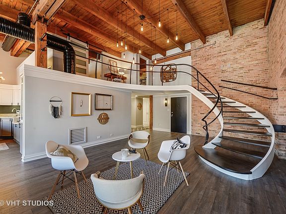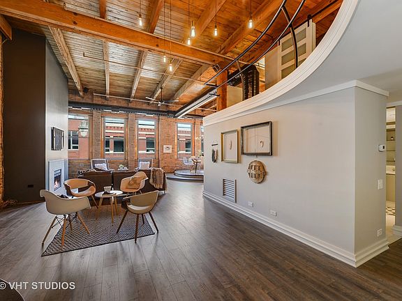 Designer rehabbed penthouse with 2 beds, lofted office and room for more! This West Loop loft is truly amazing! Stunning details at every turn. 20 foot exposed timber ceilings, huge east facing windows and skylight, city views, two floors of living space, expansive first floor living area with separate sitting area and room to add a full size third bedroom and bathroom. Beautiful curved staircase, mid century mod light fixtures and finishes, wood burning fireplace, pristine barn wood flooring, gigantic decked out bath and closet spaces unlike anything you've seen! You get an entire room of closets! Kitchen features double ovens, built in SubZero fridge, solid wood two toned designer cabinetry with tons of storage that spans the dining area. Direct access to roof from stairs within the unit with rights to build out your own terrace, green space, patio or deck with amazing city views. Indoor garage parking space available for $25K.