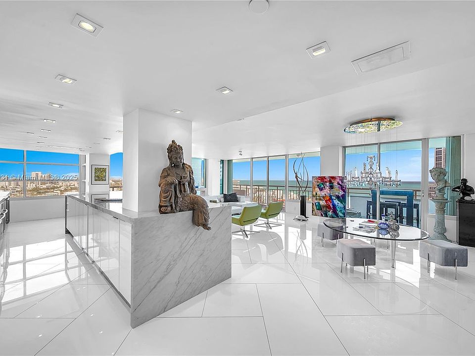 Oceanfront Designer Loft in the Sky. Location is everything, and this breathtaking 23rd-floor corner residence offers unparalleled direct ocean and city views through floor-to-ceiling glass windows and wrap terrace accessible from all rooms. Originally a 2 BR + den unit, it has been reimagined to a loft with luxurious modern aesthetics. White glass flooring throughout and Carrara marble finishes. The open-concept chef's kitchen features sleek stainless steel appliances and an impressive 15-foot Carrara marble islandperfect for entertaining. The residence boasts 2.5 marble bathrooms and includes two parking spaces and storage unit. Just completed resort style amenities include 2 pools, outdoor kitchen, tennis & pickleball courts, putting green, outdoor fire pit, dog park and great lawn.