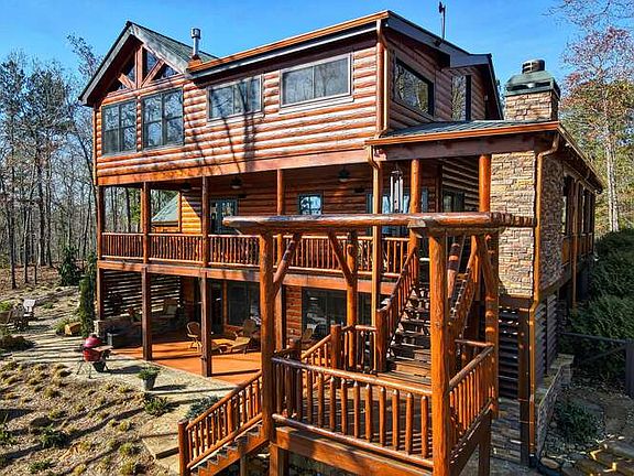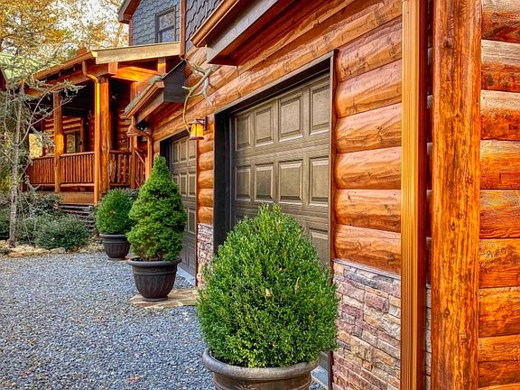 Secluded location on a private road! Exquisite log cabin with well-kept front yard that perfectly compliments home! 2 car garage hosts room above. 1,200 sqft of deck with extremely cozy outdoor FP area & plenty of space for outdoor furniture to accommodate your views! Open floor plan combines kitchen with island bar, dining area, & living room with FP. Updated features throughout the home plus unique details like railings & exposed beams. Open loft & closed in office space. Master suite on upper level with gas stove, double sinks, & jacuzzi tub. Finished basement holds bar area & living room with FP. Beautiful landscape in the back - stone path to fire pit with seating, fenced in garden area, level terrace patio goes hand in hand with a cookout, plus a designated hot tub area with small FP! Located less than 10 miles to the popular DT Blue Ridge area.