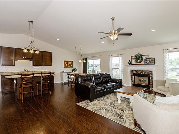 Beautifully maintained, 5 BD, 3 BA ranch in the desirable Riverdale neighborhood! This impressive home has an O/S 3 car garage, fenced yard, beautifully finished LL and approx 2,772 s/f of finished living space. There is impressive curb appeal w/brick, stone, coach lights, low maint vinyl siding and lush landscape. Features inc an open floor plan, a popular split bdr design, vaulted ceilings, woodburning FP, W/I pantry, 42 inch cabinets, SS appl, island w/seating, granite c-tops, wood laminate flooring, main flr laundry, humidifier, water softener and a composite deck overlooking the back yard w/steps to a large patio. The finished, walk out LL has approx 1,188 s/f of fantastic living space, laminate flooring, Family Rm, Rec Area, 2 Bdr, full Bathroom, an office and unfinished storage. This peaceful setting is minutes from shopping, schools, restaurants and easy access to Hwys 79 and I-70. There are community lakes, a playground and a pavilion for homeowners to enjoy. So much to love!