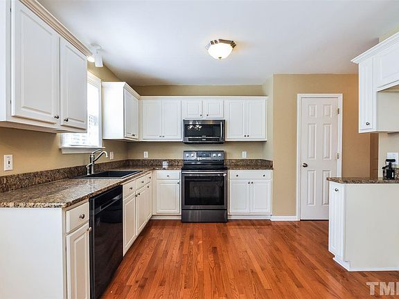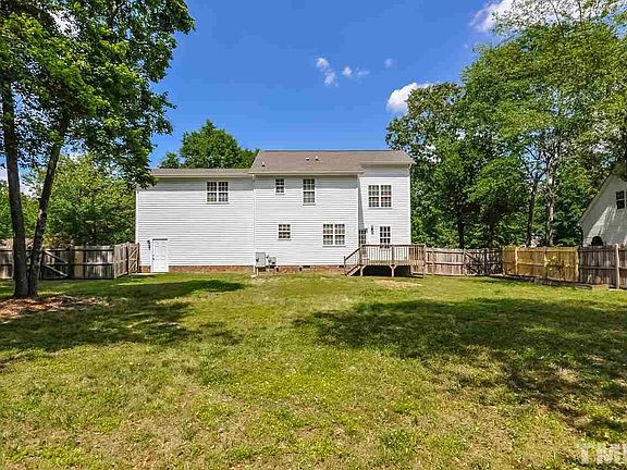 This Clayton two-story cul-de-sac home offers hardwood flooring, a fireplace, a deck, and a two-car garage.