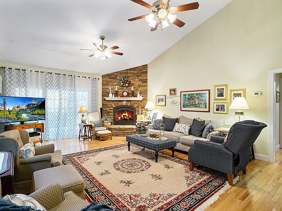 The stone path leads you through perennial blooms that begin in January and continue all year long. This home boasts beautiful outdoor living space, from the firepit and swing area, to the large front porch that makes everyone want to sit down for a glass of sweet tea and visit. The covered back deck is your own private retreat with enough room to entertain a crowd of guests no matter the weather. This home was made to entertain with southern living at it's finest! Beautiful hardwoods, crown molding, cathedral ceilings, and a stunning rock fireplace for the gas logs meet when you walk in the home. Wake up in the master bedroom where sunlight comes in the large row of windows and watch for wildlife before you step out of bed. The master bath is fit for a king, with storage space and a walk in shower in addition to the garden tub. Downstairs is a full apartment with luxury vinyl tile, a full kitchen with it's own gas range and refrigerator and large bedroom that exits onto the patio.