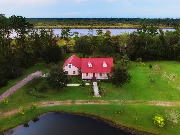 Extremely unique and unbelievable property with deep water access on the Satilla River! This private, custom built home is nestled in between a stocked fish pond and the Satilla River within walking distance of downtown Woodbine and the boardwalk! This gorgeous property boasts many mature fruit trees, has a huge woodworking workshop with storage, and has a separate well and sprinkler system. Split bedroom floorplan, volume ceilings, solid surface coutertops, central vacuum, built-ins, formal office, immense front and back porches with incredible views from in and outside of this wonderful home! A dock which had been previously applied for and approved) to TRUE DEEPWATER would complete this oasis and your dreamhome!