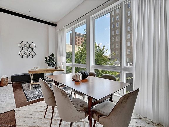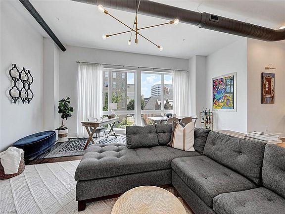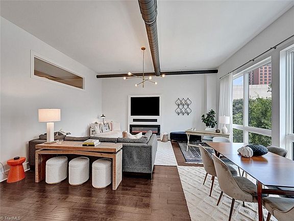Absolutely pristine two bedroom and two bath unit in sought after Twin City Lofts, the most contemporary of all the condo buildings in downtown Winston-Salem. Sleek, modern finishes include the waterfall edge quartz island in kitchen. Current owners added custom light fixtures throughout, plus new kitchen hardware. Built-in TV - 77” OLED with sound bar and linear fireplace that heats in the winter. Walk-in closets in both bedrooms offer surprising storage. One reserved space in Secure, gated on-site parking. Beautiful rooftop patio offers a bird's eye view of the heart of the city as well as grilling and entertainment space. Convenient to all cafés, restaurants and dozens of other amenities that downtown provides!