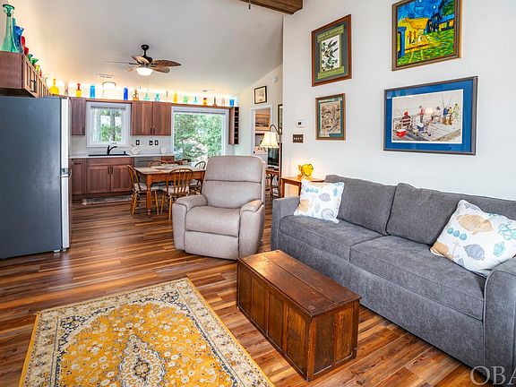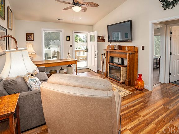 Completely upgraded and updated home located in the highly coveted Landing Community in the heart of Kill Devil Hills.  This home has been completely remodeled inside and out with updates including, but not limited to LP Smart Siding(2023), New Roof(2021), New Flooring(2021), New Windows(2023), New Decks(2022), New Kitchen, Appliances, Countertops(2022).  This is not your typical "beach box", with high ceilings in the living area and kitchen and an alternative layout. The primary ensuite is on the opposite side of the house from the other two bedrooms.  Both bathrooms were renovated over the past 2 years with high end tile and vanities.  The ground level comes equipped with a garage and dry entry utility room that leads up to the house.  The garage flows seamlessly to an outdoor covered and screened seating area in the back of the house.  On the northeast side of the home there is a recently built storage shed on a concrete slab.  The property is beautifully landscaped and well thought out with a custom outdoor shower and planters boxes lining the back side of the property line. There is a small creek bordering the property that does connect to the sound, enjoy feeding the turtles and seeing small fish swim by.   Walking distance to the beach, sound, shopping and popular restaurants, this is a location that has it all.  The Landing Lot Owners Association has a community dock and boat ramp that you can join for a small fee.  Short notice showings can be accommodated, don't miss your chance to own this like-new construction for a great price.