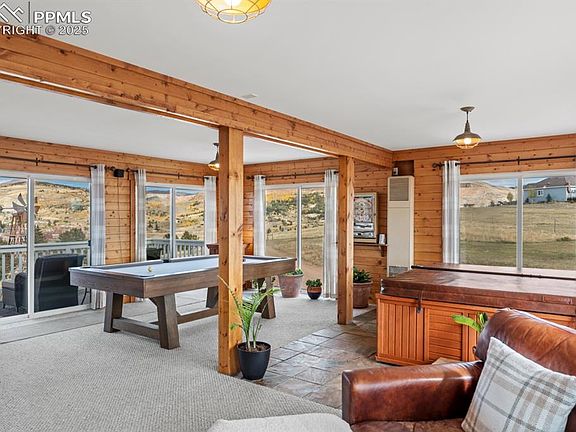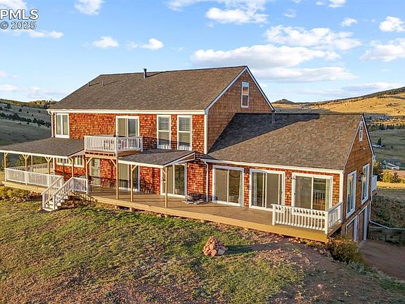 Your Private Mountain Retreat with 360° Views, Horse Zoning & Short-Term Rental Opportunity! Perched atop a hill with unmatched views of four iconic Colorado mountain ranges—Pikes Peak, the Sangre de Cristos, the Collegiate Peaks, and the San Juans—this 7.77-acre property offers unrivaled privacy, panoramic beauty, and flexible use potential. Zoned A-1 and fully fenced with a security gate, the land is ready for horses, livestock, or your next investment venture, including short-term rentals with no city license requirement. This 3-bedroom, 3-bath home is drenched in natural light from expansive windows in nearly every room, capturing breathtaking views from sunrise to sunset. The chef’s kitchen features granite countertops, stainless steel appliances, a walk-in pantry, and wraparound mountain views, making it the heart of the home. Entertain in style with a massive living room, a game room complete with a dry bar, pool table, and hot tub, and a spacious wraparound porch perfect for coffee mornings or watching fireworks over Pikes Peak on New Years & 4th of July. The primary suite offers a spa-like retreat with dual walk-in closets, a luxurious 5-piece bath, and its own private balcony. A full walk-out basement with 9-foot ceilings provides additional room to grow—ideal for finishing into more bedrooms, a gym, or rental space. Extras include: • Optional Assumable Loan • Mineral rights included • Two offices (main level and basement) • Attached oversized 2-car garage and 10+ off-street parking spaces • Updated Lighting, Exterior Updates, New Roof & Gutters, Paint and more! This property is not just a home—it's a lifestyle investment. Whether you're dreaming of a mountain sanctuary, vacation rental, or horse property, the opportunities here are endless.