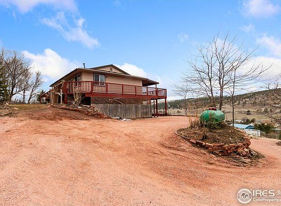 Perched on a hillside just a few min from Carter Lake, this 3bd, 2ba ranch over walkout bsmt home offers valley views, peace & relaxation, nature & room to breathe on its 1.24 acres, yet w/ ease of access to Loveland, Longmont, I-25. Great for full-time living or a weekend getaway. No HOA & served by its own well, septic & propane, but connected to PV REA. You'll appreciate the open flr plan, wood fireplace, covered wrap-around deck, covered patio, manicured landscape setting, chicken coop, blooming flowers all around throughout spring, summer & fall, rock outcroppings & mountain range views. Updates throughout including new water heater, new pressure pump & new carpet. This is a special property ready for your enjoyment.