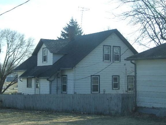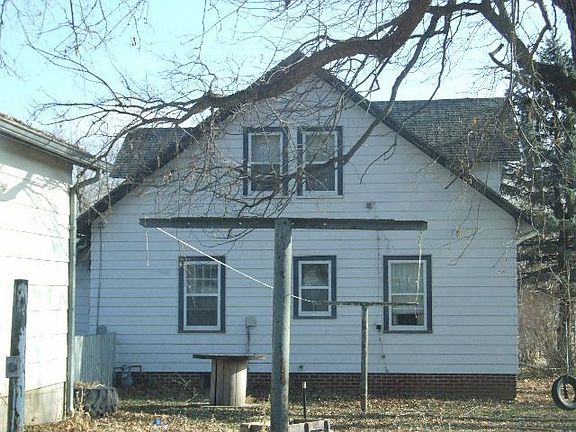 Exterior Features: Two story white home with green accents, wood/vinyl exterior wall, asphalt shingle roof appears to need work, curb appeal is fair. Interior Features: Living room has wood floors, walls are intact, kitchen cabinets & sink are in place, looks to need some cleaning, wood backsplash/walls. Beds are carpeted with closet space, seem in good condition. Bathrooms also intact with appliances in good order. Seems in fairly good shape overall.
