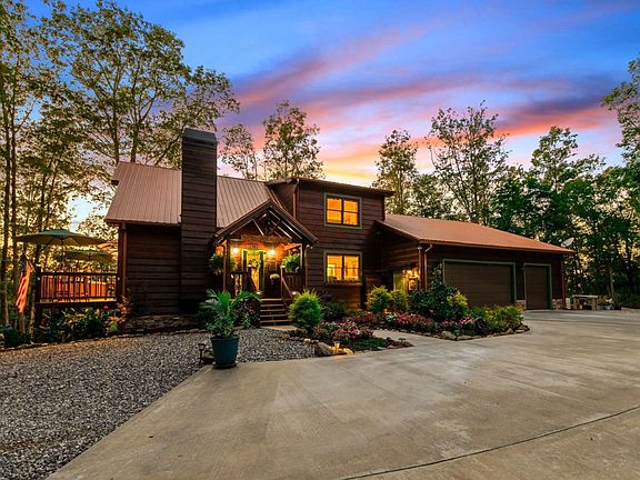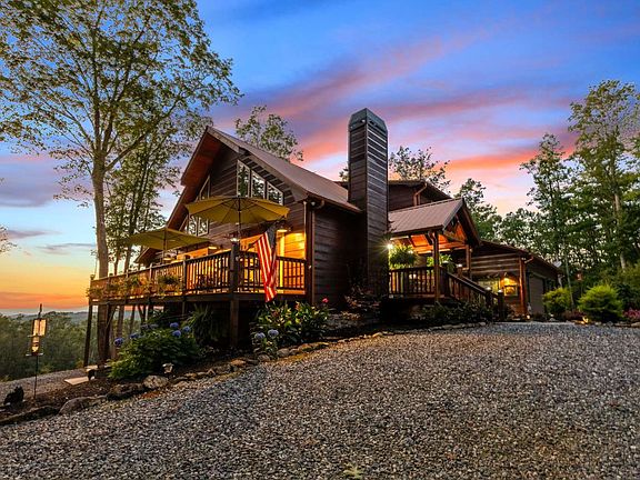Looking for a rental opportunity with privately situated unrestricted land? Explore this Blue Ridge hidden gem boasting Long Range Mountain View + Unrestricted Property. Perfectly situated on 15 acres of natural beauty, this exceptional 4-bedroom, 4-bathroom cabin provides a peaceful retreat. The well-maintained exterior and landscaping make for a captivating first impression. Relax in the private patio with a fire pavilion that adds to the enchanting atmosphere of the property. Upon entering, you'll be welcomed by the inviting and practical open concept living space. The impressive kitchen boasts modern countertops, high-end appliances, and a spacious pantry, ideal for entertaining. The main level features a primary bedroom with a fireplace, a luxurious ensuite bathroom with granite counters, beautiful tiled showers, heated floors, and access to the main porch. Additionally, there's an upgraded laundry area and a designated office space. Upstairs you will find a master suite with a recently renovated shower, Italian flooring, and granite countertops. The terrace level includes a bunk room, bedroom, and full bathroom, along with an outdoor garage equipped with heating and cooling systems. Notable features include an expansive 80-foot deck perfect for enjoying mountain sunsets, newly installed air conditioners, 3 car garage, whole-house generator, a water well generator, a saltwater hot tub, extra storage space above the garage, and energy-efficient solar panels.