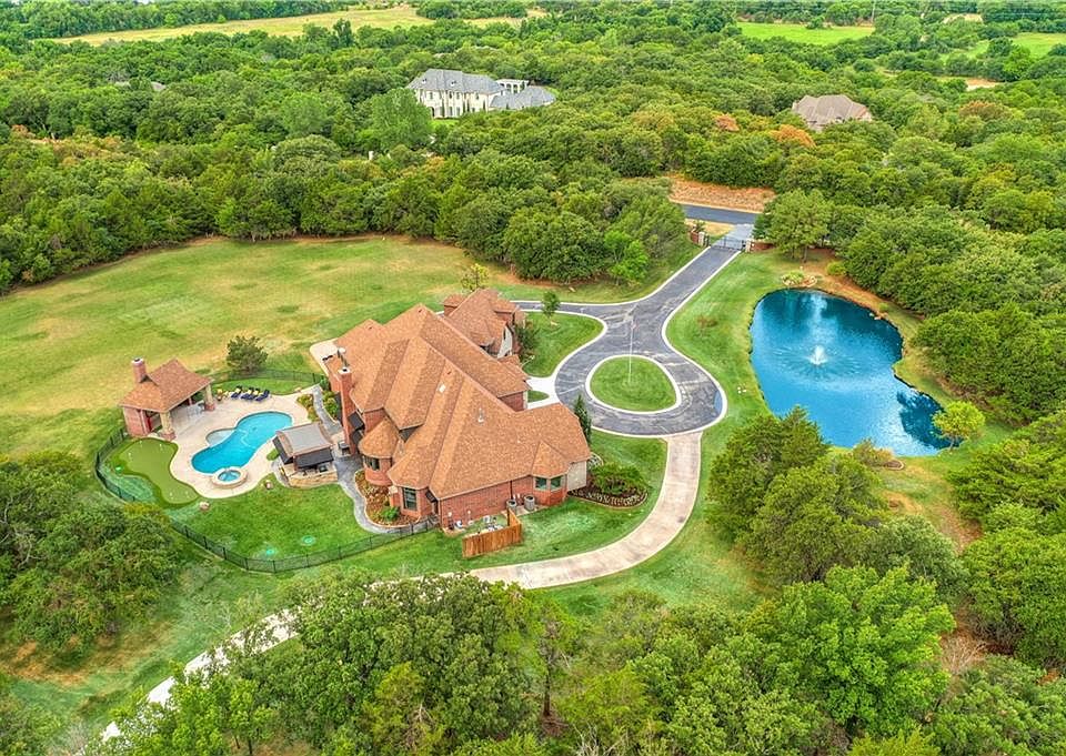 Amazing Luxury Acreage Property Loaded with Amenities! 7.8 Wooded Acres with a Gated Entrance, beautiful Pond with Fountain, Swimming Pool, Cabana, Putting Green, Sport Court, not to mention a high-quality Guest House that is almost 1,500 square feet & not included in the main house footage. Main house has 4 bedrooms, 4 full bathrooms, 2 half bathrooms, study, theater room, bonus or exercise room. Master bath has been completely remodeled with spacious round bath tub, walk-in spa-like shower, double vanities, double closets (one is the safe room). Master bed features a sitting area with fireplace and back yard access. Living area has vaulted ceiling, floor to ceiling stone fireplace, large windows & curved staircase leading upstairs. Theater room includes all the equipment & seating. Excercise/bonus room is upstairs also in addition to 3 beds and 2 baths. Guest house includes 2 bedrooms, 1 1/2 bathrooms & spacious kitchen/living & has a 4 car garage attached with lots of patio space.