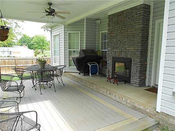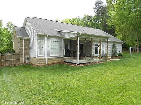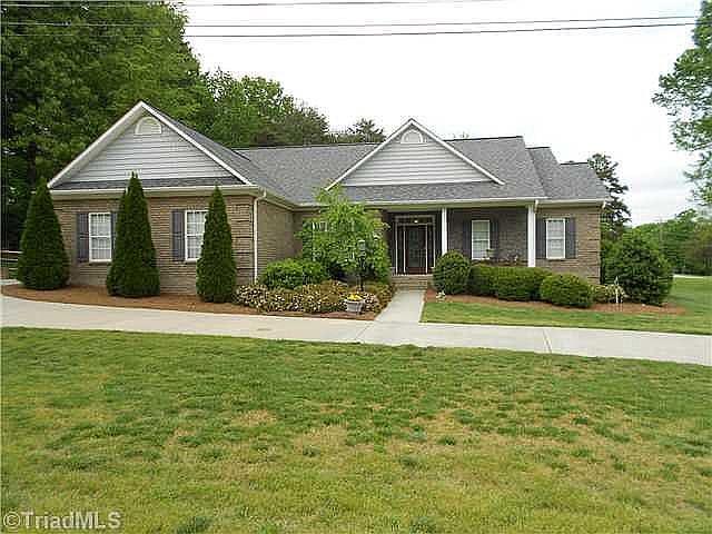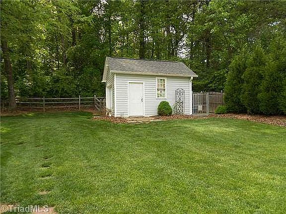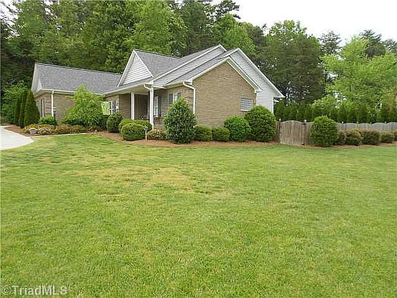 Beautiful home with lots of extra features. Tall ceilings, crown moldings. 2-sided fireplace serves vaulted living room and covered patio. Tray ceiling master. Double sinks. Huge master closet. Arched doorways. 2" Plantation blinds. Large fenced backyard. Circle driveway. Low traffic. Located at end of street. "Man Cave" storage building with roll-up door could be additional garage. Contact Owner at 336-403-2564