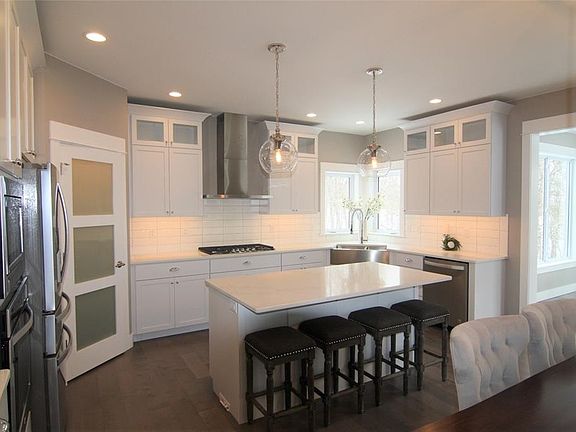 A new walk-out open floor plan setting on over 1/2 acre has a 4 seasons sun-room w/ an abundance of natural light, private wooded back yard, 4 stall garage, 5 bedrooms plus a main floor office. Featuring a gourmet kitchen with a gas cook top, SS hood vent, wall ovens, upgraded SS appliances & cabinetry, SS farmhouse sink, wine fridge, quartz counters throughout, laundry room w/ a sink, drop zone lockers, great room built-ins w/ floating shelves & stone surround gas linear fireplace, great room ceiling beams