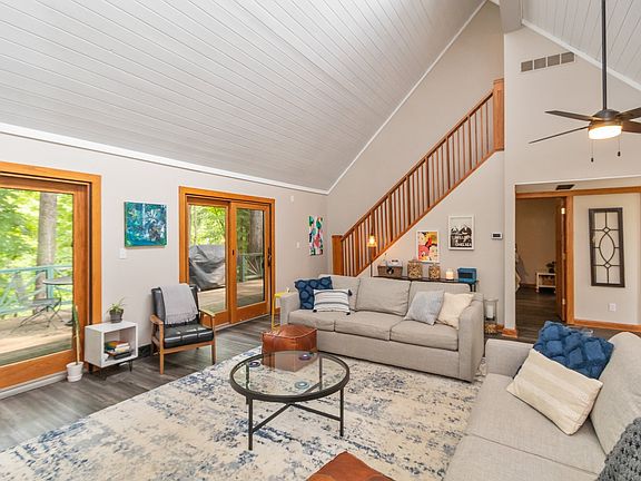 Beautiful waterfront home on large lot in highly sought after Painted Hills Lake Community.  The covered front porch welcomes you into this lovely home. Interior features include a huge great room with vaulted ceilings, two sided wood burning masonry fireplace, and windows galore for light and amazing views. Kitchen with breakfast bar overlooking fireplace, granite countertops, and Samsung stainless steel appliances. Primary bedroom and laundry on main level.  Exterior features a .85 acre lot, large back deck, boat dock and basketball court. Updates include fresh interior/exterior paint, new roof, gutters, LTV flooring throughout main level, carpet on upper level, new refrigerator, oven/range, washer, dryer, updated baths and HVAC system.