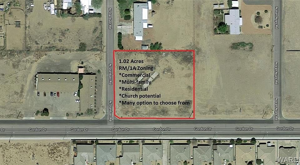 This 1-acre property sits just outside the Kingman city limits. With a very unique county zoning of RM/1A you can do nearly anything on this property. This zoning allows for the following Per the Mohave County Zoning Ordinance: A single-family dwelling, including a site-built home, a manufactured home (see Section 37.H) or a factory-built building, designed and used for single-family occupancy as defined in this Ordinance is allowed. Multiple dwellings, group dwellings such as cooperative apartments, condominium projects, townhouses, or patio house developments, duplexes, professional office buildings, Assisted Living Centers, and commercial dwellings are allowed. Also, child care, adult foster care with a Home Occupation Permit, as provided in Sections 37.L, 37.Q, and 37.S, and other uses similar to the above uses are allowed. In addition, factory-built buildings may be used for duplexes, multiple dwellings and general commercial buildings, if they are so designed...Churches, libraries, museums, schools, hospitals, parks and playgrounds, and public and quasi-public buildings... So many options on this corner parcel that fronts on both Gordon & Stardust.