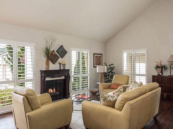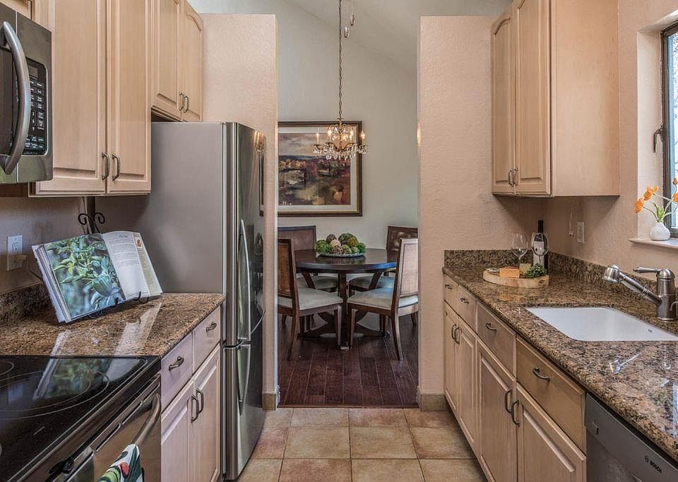 Sunny single-story end unit in desirable Riverwood. Beautifully renovated with granite counters and stainless steel appliances, stone tile bath, etc. The high cathedral ceiling and dark flooring in main living area create a spacious yet cozy feel to living room. Sun drenched paver patio is beside a grassy open common area. On cool Carmel evenings, cozy up to the gas fireplace in the living room. Unit includes a master suite with its own full bath and walk-in closet, a second bedroom and hall bathroom and a one-car attached garage. Brand NEW heater, ducts and water heater! Complex features a heated swimming pool with mountains as a backdrop. Walk to the Barnyard and Crossroads for dining and shopping. This is how condo living was meant to be.