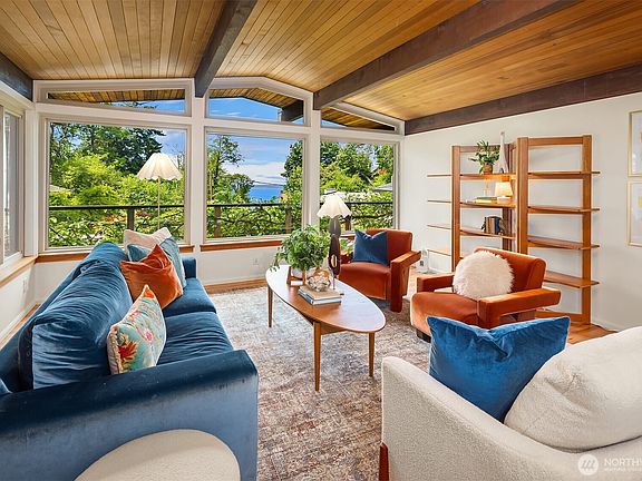 A soulful sanctuary in beloved Gatewood, surrounded by lush gardens on a quiet cul-de-sac. This 4-bed, 3-bath home offers water views from nearly every room, vaulted wood ceilings, and warm mid-century charm. Spacious kitchen with fresh finishes, skylights, and private deck flows into dining and living rooms with sunset view balcony and wood stove. 3 beds on main with primary ensuite bath. Downstairs, a rental-ready 1-bed ADU with separate entrance and Sound views. Outdoors is a gardener’s dream- mature plantings, bluestone paths, cedar hot tub, and potting shed. Features: refinished hardwood floors, solar panels, heat pump + AC, & 2-car garage in back. Useful office/storage room off driveway. Minutes to Lincoln Park, ferries, and shopping.